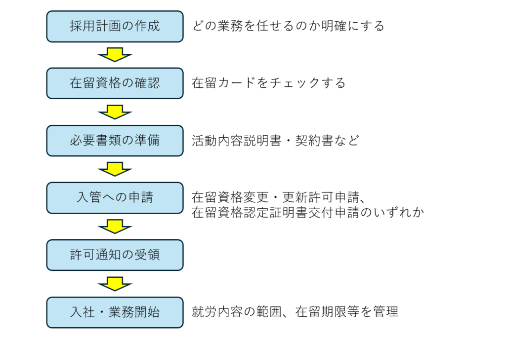 重要なのは「適切な在留資格の確認」と「外国人材が働きやすい環境整備」です。特に在留資格は、不法就労となってしまうリスクを避けるために慎重な確認が必要です。