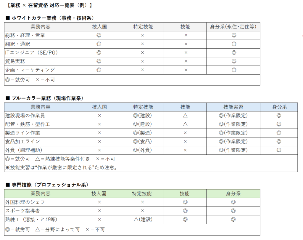 在留資格の種類ごとに、認められる業務の範囲は大きく異なります。たとえば、ホワイトカラー業務が中心の「技術・人文知識・国際業務」では、荷物の運搬や店舗スタッフなどの単純作業は原則できません。